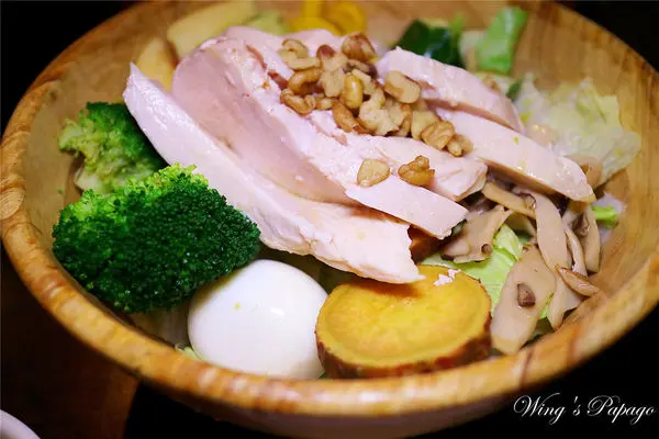 用料豐盛有新鮮生菜、甜椒、地瓜、小黃瓜、小蕃茄、蘋果、杏鮑菇、蛋及核桃,