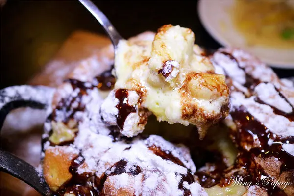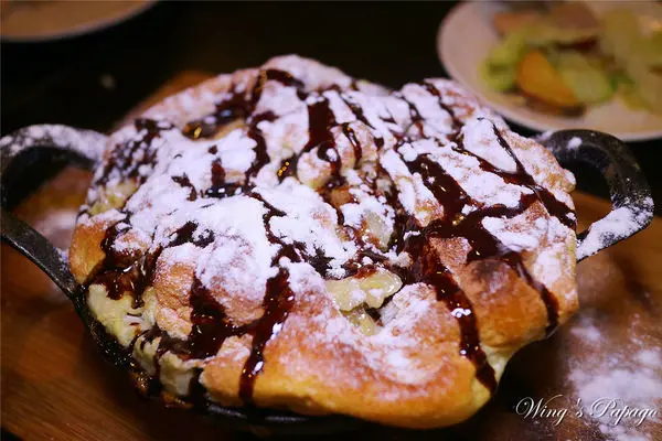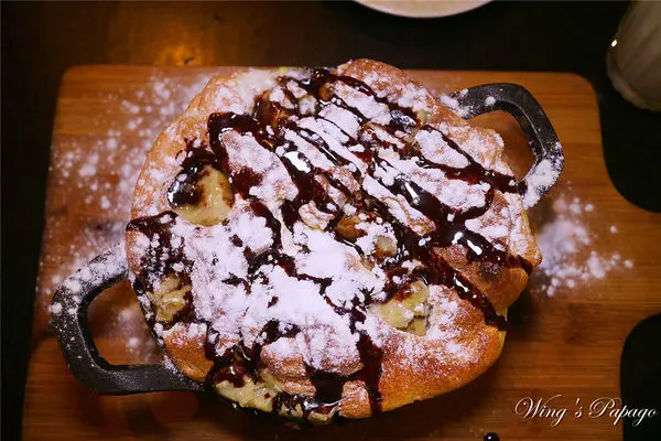 下層則是鐵鍋鬆餅,底層還會略帶鍋巴感,看起來非常誘人的一道甜點。