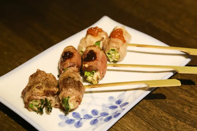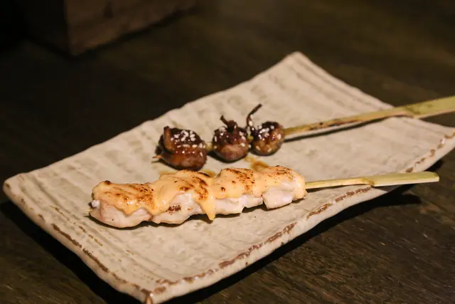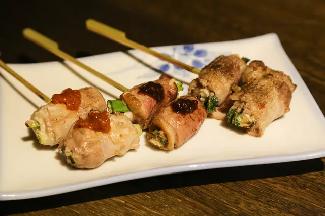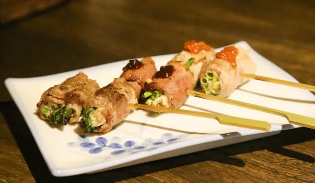 雪花牛蔥串->櫻桃鴨肉蔥串->霜降豬肉串