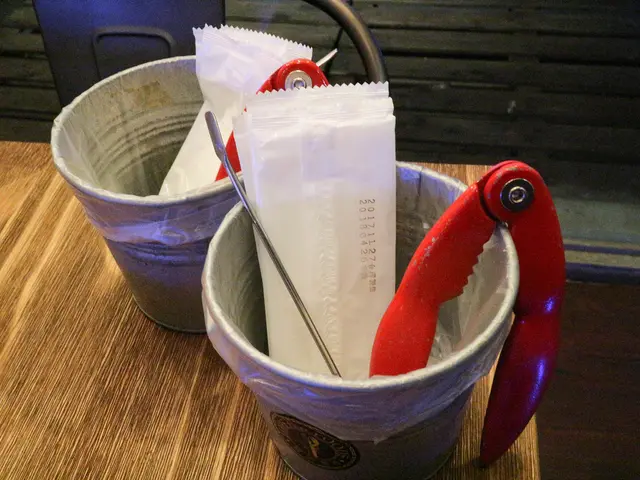 桌子上擺放上小垃圾筒與夾破龍蝦大螯的器具