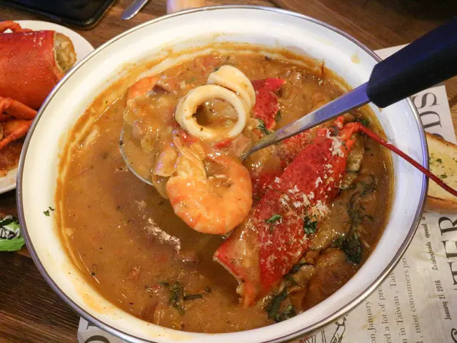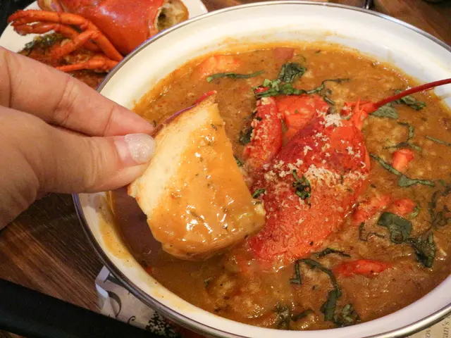 燉飯湯底使用滿滿的龍蝦頭與大量蔬菜敖煮,龍蝦頭經過烤過再長時間熬煮後,把龍蝦頭的精華經過6小時熬煮出來後再打碎過濾,