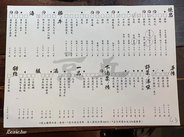 京丘・炭火燒鳥的消費水準跟專業的燒鳥、串燒居酒屋差不多,人均大概可以抓個700~900左右,低消$500/開瓶費$500/10%服務費。店內的特色是京丘老闆曾赴日本學藝,且醬料都是日本的,再來店裡使用備長炭燒烤、還使用台灣土雞肉。食材、醬料、炭火都用得不錯的話,預期餐點水準應該會不錯。