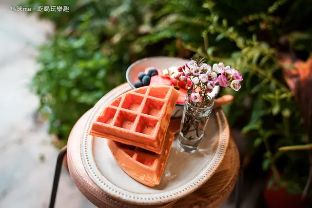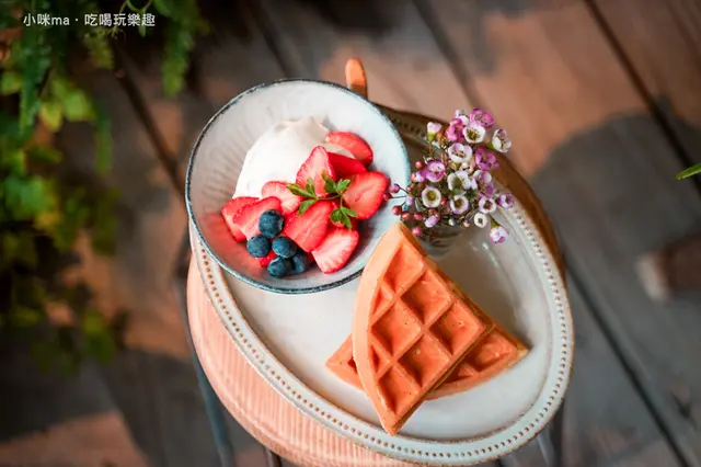 鬆餅的口感鬆軟度剛好,吃起來脆脆的,擺上鮮花裝飾浪漫度100分耶
