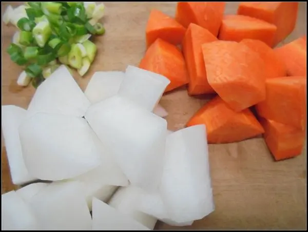 準備些燉湯的材料,紅、白蘿蔔、蔥花。