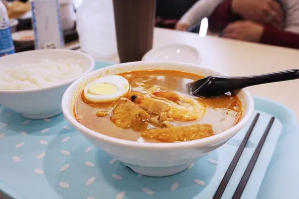 我稍微吃了一口偷米點的這個叻沙,湯頭也是走比較濃郁的感覺,看起來紅通通卻一點都不會辣,反而是有一絲絲的甜和鮮味,拌著飯吃很可以