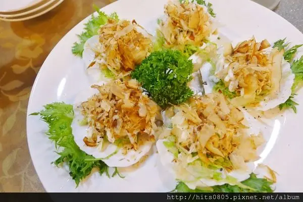 南非珍珠.大顆扇貝加上美乃滋.鋪著生菜和柴魚片.頗有章魚燒的感覺