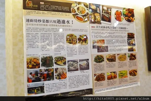 壁面掛著商周和愛評網的美食報導.大師廚館炒的菜只用過濾水.讓人吃得更加安心