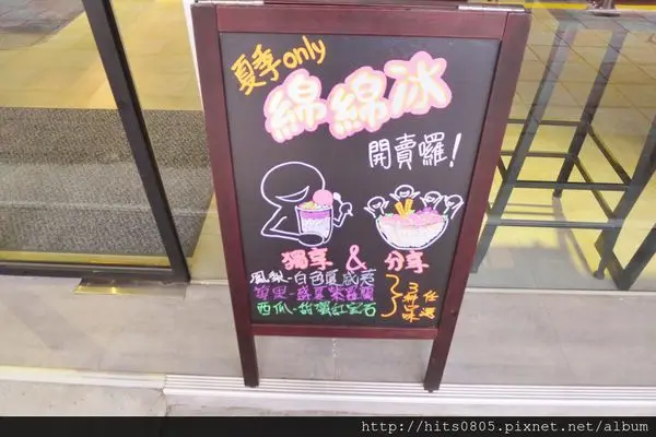 門口擺放著小黑板.用繽紛的粉比寫下夏日only綿綿冰開賣啦~