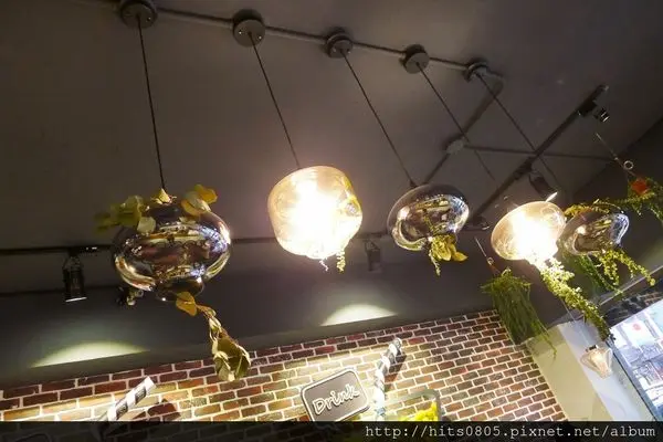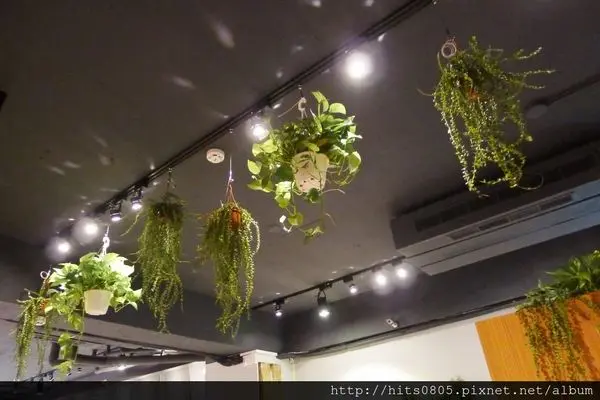 帶有工業風的線路管線天花板.上面用綠葉盆栽來作裝飾.