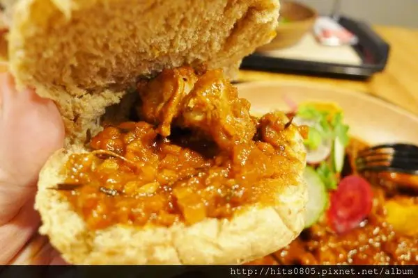 麵包切一半.中間包夾著醬汁和燉肉.能增加麵包的濕潤度.同時有飽足感~