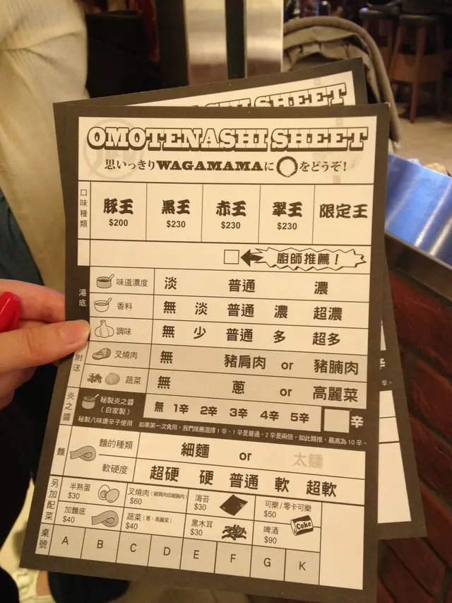 點單長這樣,調味、辣度、麵條的軟硬度都能夠進行調整,相當客製化,最讓人開心的是連蔬菜都能選,終於可以擺脫拉麵裡的蔥~