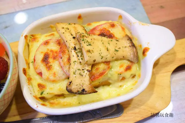 搭上滿滿香濃起士與杏鮑菇