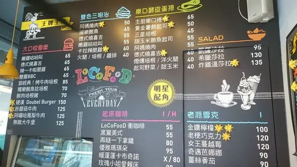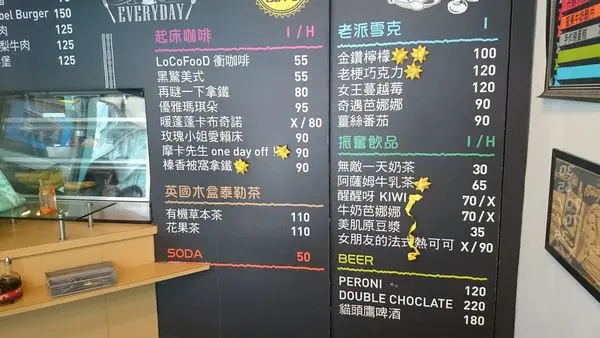 黑板菜單。沒有點菜單,直接在櫃台看著黑板跟老闆點菜。有緞帶花的是推薦暢銷商品,商品的名稱也都很逗趣,王牌主角是主食,明星配角是飲料。