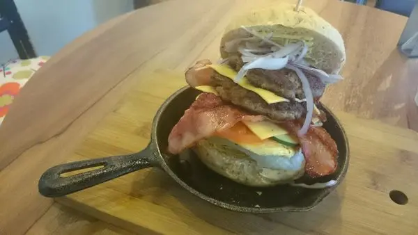 硬漢Double Burger (NT$150)。內用的餐點都會用可愛的平底小鐵鍋放在木板上送來,木板跟鐵鍋似乎是時下最夯的上菜器具,連早餐店都參一腳。