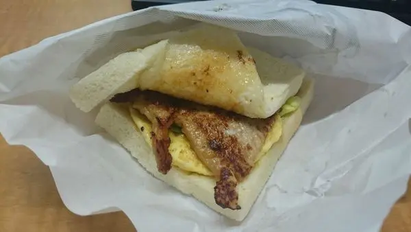阿嬤燒肉三明治+起士 (NT$55)。這是另外一個大推餐點,裡面的豬排肉完全就是媽媽自己在家裡醃里肌肉的味道 (嗯...那幹嘛不在家裡吃就好? 阿就媽媽不在身邊嘛!! XD)