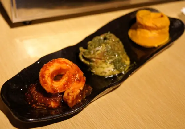 (左起:蒜頭辣椒、黃豆芽、肉味噌、泡菜)