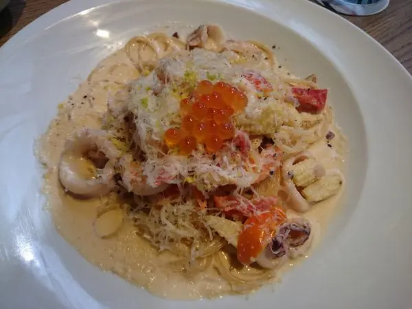 有新鮮小卷、現剝帶殼蝦和鮭魚卵。重點是醬汁!蒜味奶油白醬醬汁收得剛剛好,纏繞在麵條上配著海鮮一起吃下肚,開心呀~