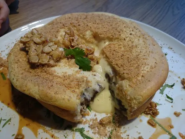 這鬆餅光是用看的,就感覺得出蓬鬆軟香。上面是原粒焦糖花生、花生粉、旁邊有焦糖花生醬,切開後Mascarpone Cheese熱餡流瀉而出,還沒完,底部還有一層黑糖麻糬...