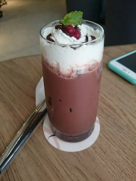 像我點的這個喝莓果黑森林,上面是鮮奶油,下面則是由覆盆子果泥和濃稠法芙娜70%黑巧克力組合而成,真的邊喝邊有吃莓果黑森林蛋糕的感覺呀~~