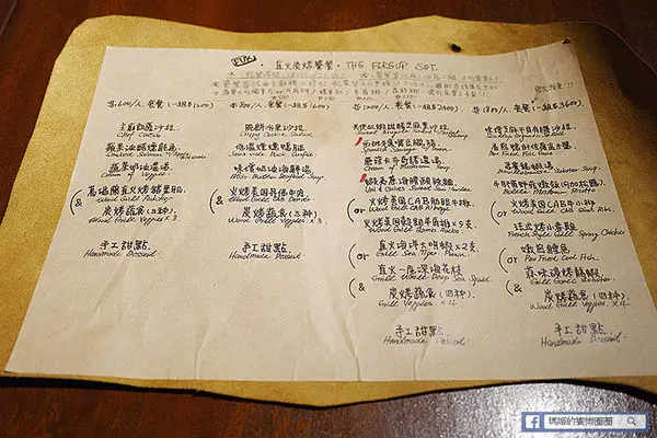 菜單用的是皮革製作而成,今天品嚐的「晚間雙人套餐」,以每人$600、$800、$1200到$1800(需三日前預訂)等不同價位設計,讓共享美食成為一種文化,其實我現在外出和朋友用餐也多半都是所有東西一起分享,更可以品嚐出美食的箇中滋味。其它詳細菜單請參考棧 F-U Kitchen粉絲團。