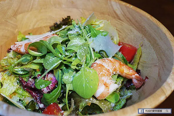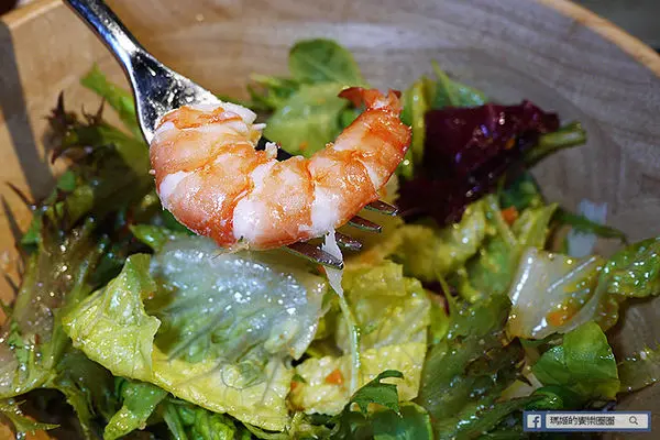 「天使紅蝦甜醋芝麻葉沙拉」加入少見的芝麻葉和多種生菜,佐甜醋醬汁吃起來十分清爽又帶著微酸的滋味。