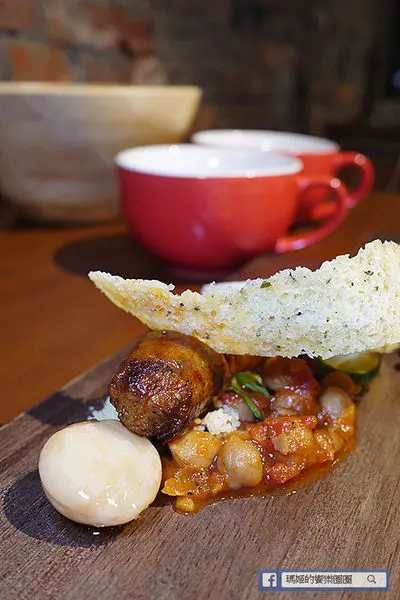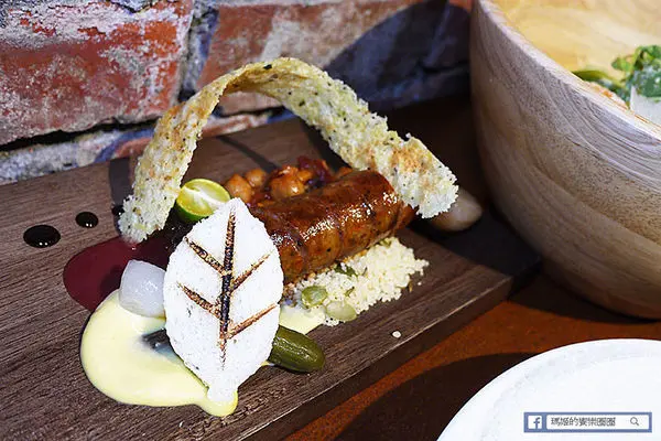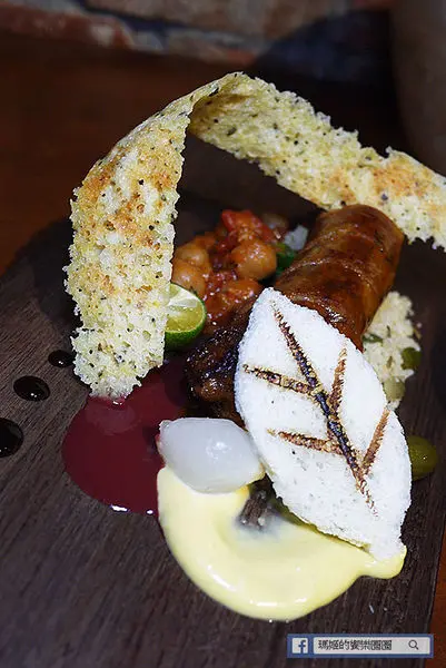 「西班牙鷹嘴豆臘腸」特別用了起司和麵包做成捲曲條狀和葉子的造型做裝飾,雖然吃起來不酥脆了,但擺盤有畫龍點晴之效。