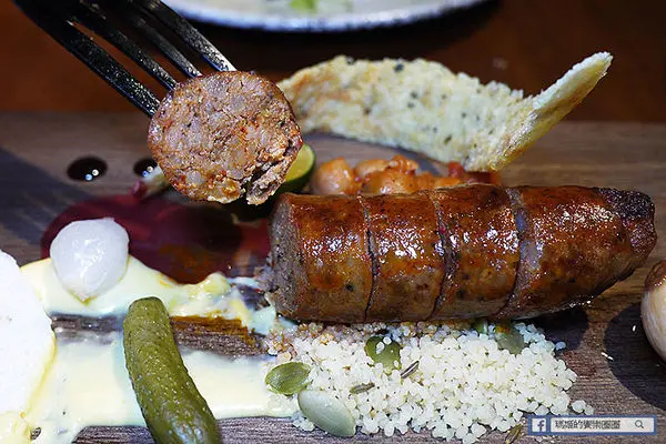 我特別喜愛裡面的臘腸,帶著微微的辣味,在口裡咀嚼出濃烈的香氣,是很常見的異國料理美食。搭配旁邊的珍珠小米和酸黃瓜,在這道開胃菜裡有豐富的口感。