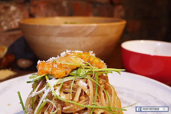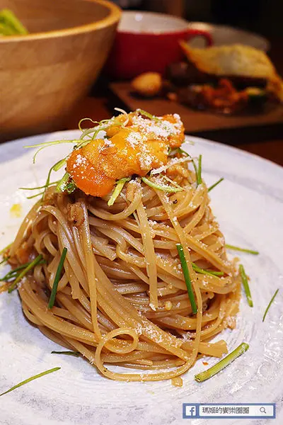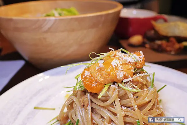 「蝦夷蔥海膽酸辣麵」像個金字塔狀的擺盤,上面在擺上新鮮海膽鮮味又霸氣!