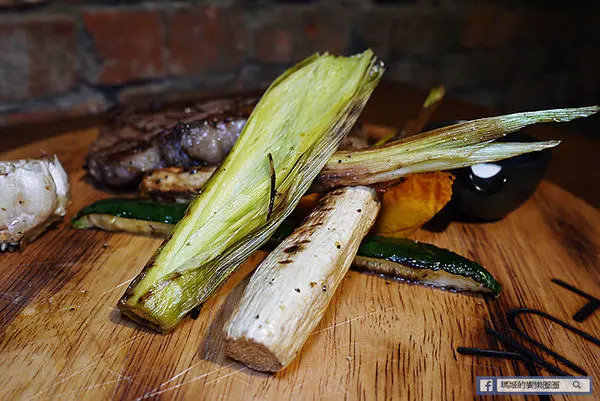 搭配的炭烤蔬食有玉米荀、筊白筍、節瓜和地瓜,玉米荀、筊白筍和節瓜在烤過後依然保有水份