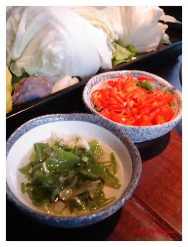 白飯和醬料是自取~看看這紅紅綠綠的青蔥和辣椒口水就快流下來了