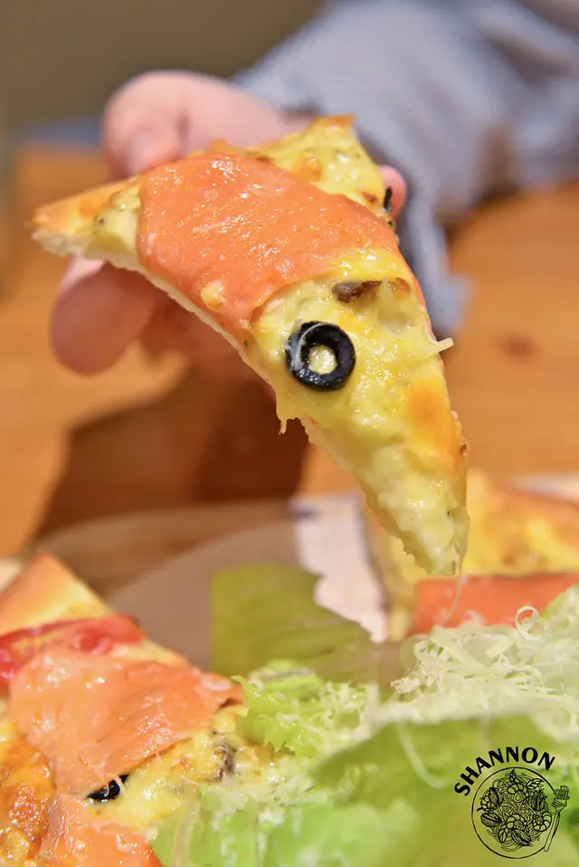 這薄皮PIZZA我覺得皮有些硬一點,雖然算是蠻有起司香還有些鮭魚的鹹香味道,但是我對這PIZZA的吸引力不大,所以最後大部分交給朋友解決!