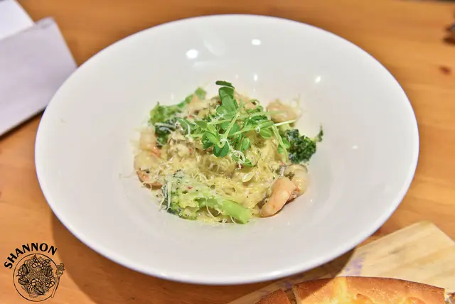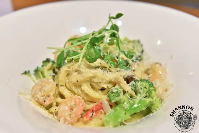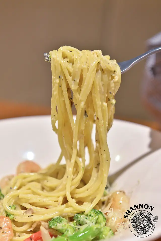義大利麵的分量還蠻多的光用看的會飽,而這個蝦子非常脆口覺得像是叫貨整個的那種但就也毫不吝嗇的放,麵條的口感算還OK的有些Q但沒一下下就會冷掉必須快食用