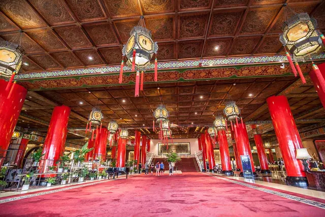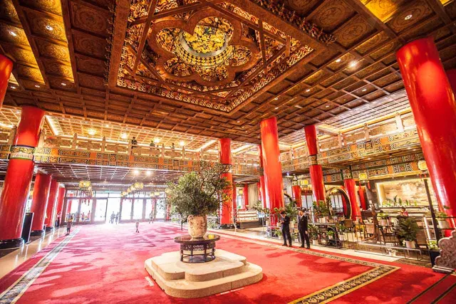 走進圓山大飯店,大廳富麗堂皇,超高挑的空間設計奢華豪氣感盡現,上面掛了許多中國風的宮廷式大吊燈,主色調為中國吉祥代表色大紅與金色,整體視覺效果相當金碧輝煌,耀眼奪目,跟一般飯店不同的事,圓山大飯店多處都使用大紅色地毯,貴氣感倍增
