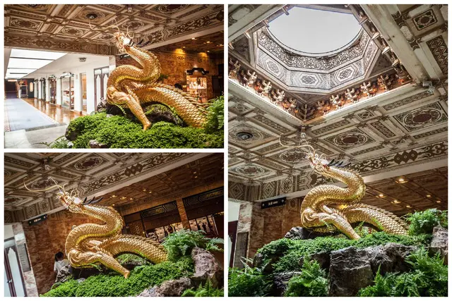 走上二樓穿過迴廊,就可以看到這座百年金龍矗立於此,這金龍原本是在台灣神社裡,第二次大戰時噴水銅龍毫髮無傷的躲過戰火,戰後圓山飯店將銅龍渡金,便成為金龍廳百年金龍的主角了