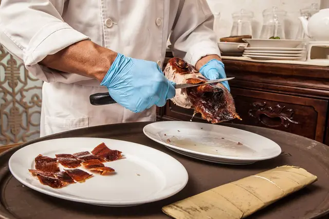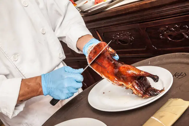肉汁用噴的!隨著師傅片鴨的動作,刀間傳來脆皮酥脆的聲音,肉汁不斷地從切口湧出!