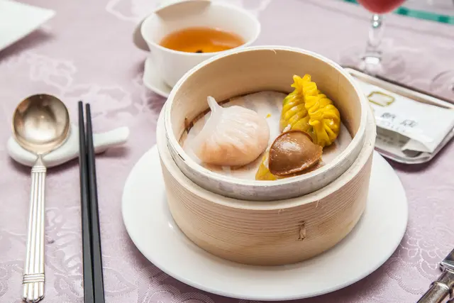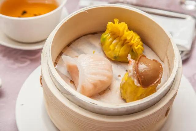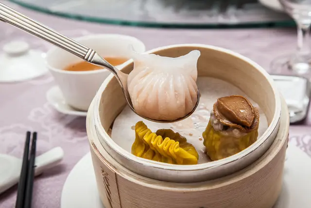 水晶明蝦餃超霸氣,裡面放的是口感紮實的明蝦,一口咬下Q脆且鮮味十足,鮑魚燒賣上面豪氣地放一隻小鮑魚,金龍海鮮餃則是呈現多層次的海鮮風味,口味清爽