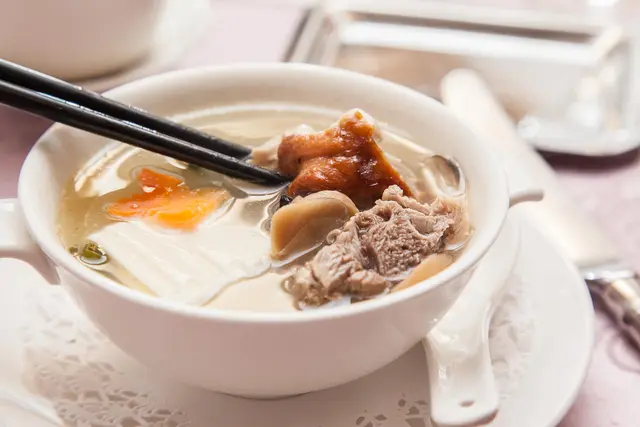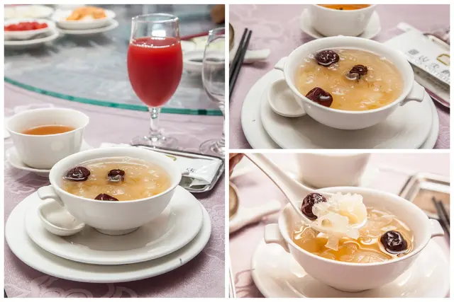 用白木耳、紅棗、蓮子熬煮的冰甜湯,甜而不膩,咬咬很愛裡面的紅棗香氣,清香解膩!