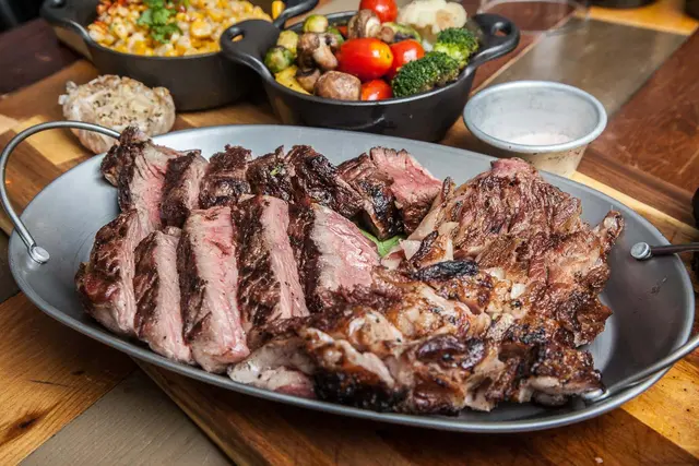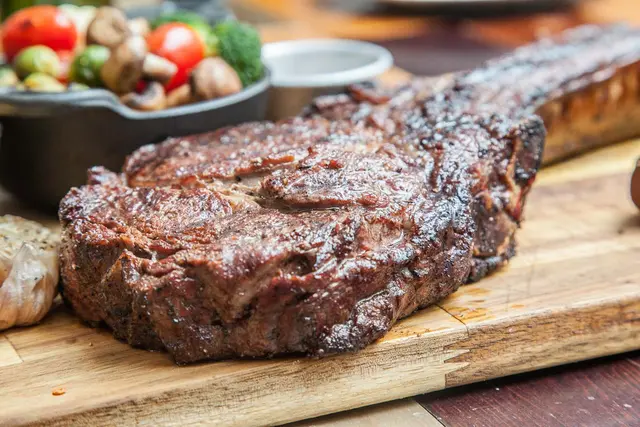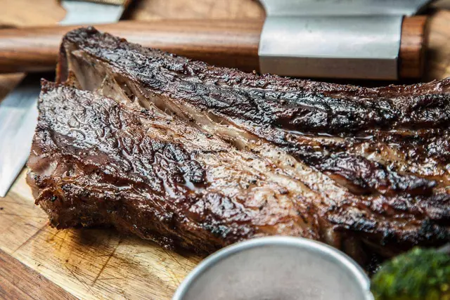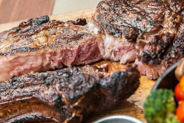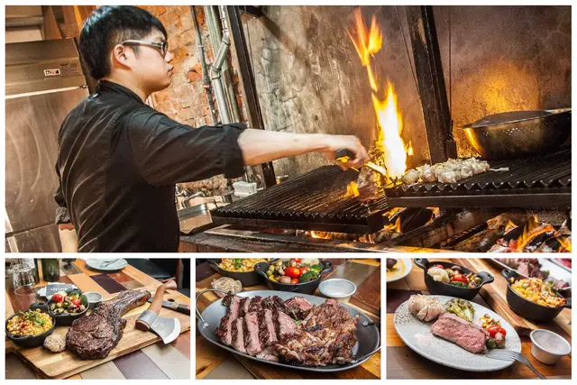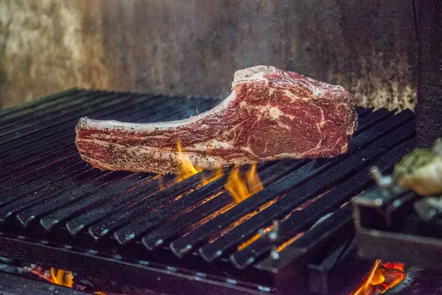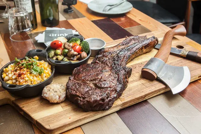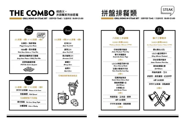 戰斧牛排因為外型酷似一把大斧頭,所以才取名叫戰斧牛排,一頭牛僅能提供10~12客,厚度足足有五公分那麼厚,直接以原汁原味直火碳烤,以蒜味胡椒在表面調味,以直火350度的高溫鎖住肉汁,牛排在烤架上烙出漂亮的烤痕及迷人的碳烤香氣