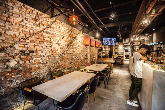 紅磚牆的裂縫棧 F-U Kitchen 直火廚房巧妙的運用我們很熟悉的樂高積木來填充,樂高積木就像爬樓低一樣,讓看似一般的紅磚牆面別有一番童趣氛圍