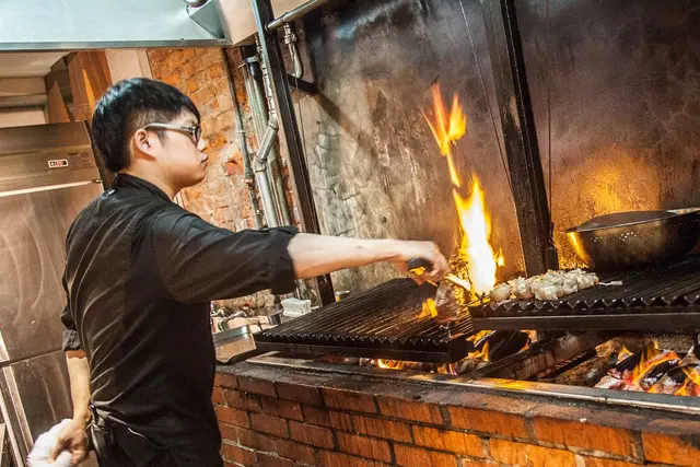 直火燒烤極具考驗主廚的功力,因為不像電爐可以直接控制火力大小,所以只能藉由旋轉轉軸,上下移動烤架來控溫,棧 F-U Kitchen 直火廚房採全開放式的燒烤廚房,可以滿足顧客視覺、聽覺、嗅覺的絕佳感官效果呢