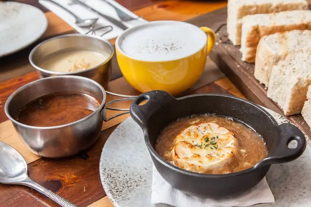 法式傳統烤洋蔥湯、牛蒡奶油濃湯、卡布奇諾蘑菇湯、義式蕃茄海鮮湯