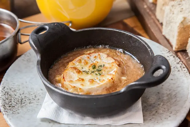 法式傳統烤洋蔥湯口感也很棒,洋蔥事先烤出甜香氣再去熬煮,湯頭充滿濃郁的洋蔥甜跟軟綿口感