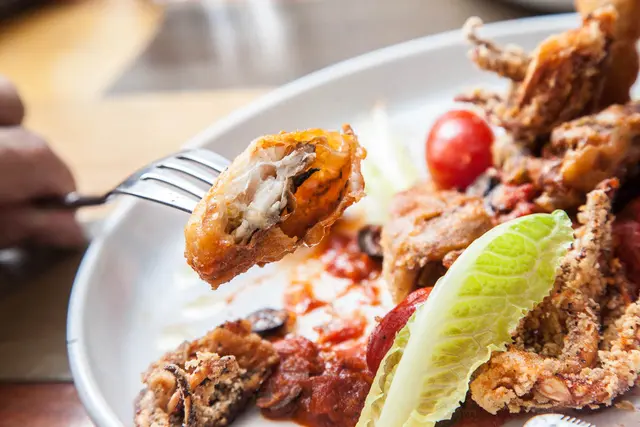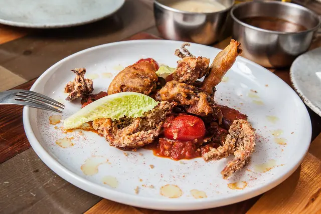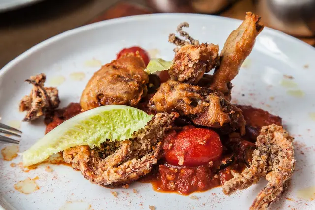 魷魚、多利魚是裹杜蘭小麥粉去油炸,軟殼蟹則是用麵糊,魷魚、多利魚吃起來外表酥香裡面軟嫩,軟殼蟹則是裹上麵糊油炸,將軟殼蟹的風味水份都鎖在裡面,並以卡宴辣椒粉來調味,微微刺激的辣感更加襯托出海鮮的鮮甜度