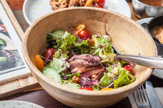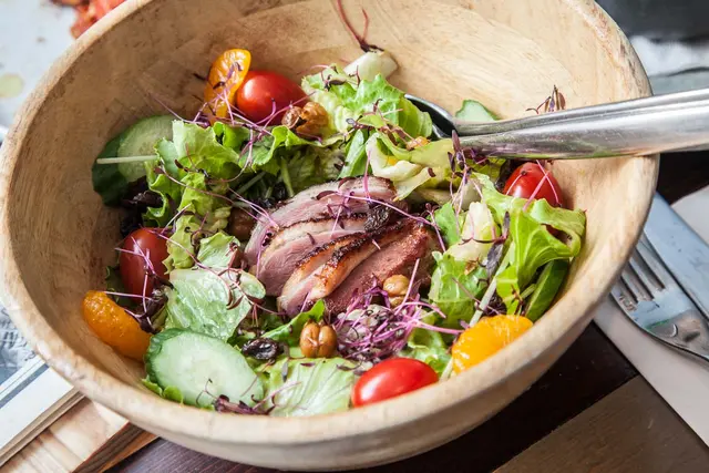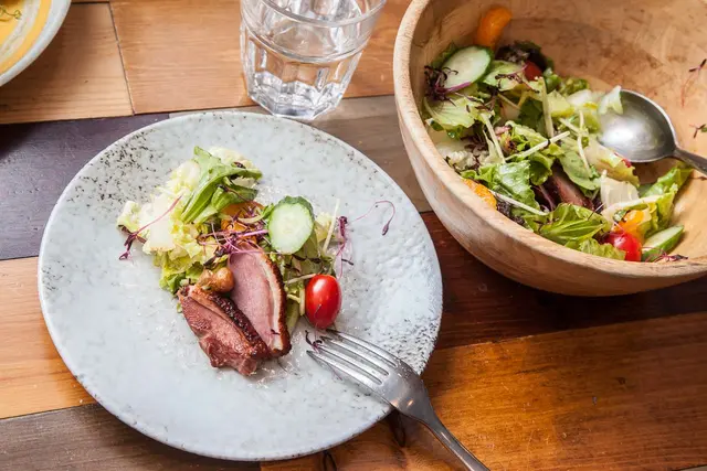 爽脆的生菜拌上清爽酸甜的橙醋醬,沙拉裡還加了口感綿鬆香甜的鷹嘴豆,搭配軟嫩油香的鴨胸一起入口,清爽多層次的口感十分開胃