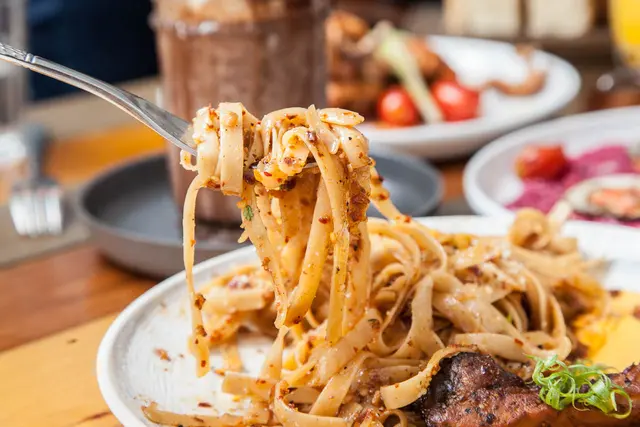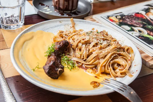 咬咬超愛這款義大利麵!豬肋排是用宜蘭的葛瑪蘭黑豬肋排,主廚特製的墨西哥醃料醃漬兩天後爐烤,義大利麵是選用自製富嚼勁的寬扁麵,以自製麻辣醬炒製,淋上黃切達起士醬,上桌時可以聞到麻香味及起司香氣
