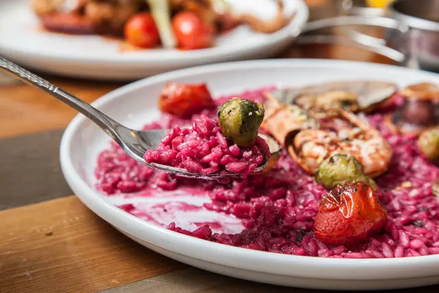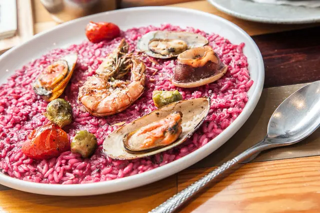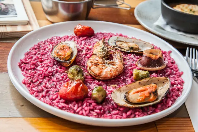 玩顏色海鮮燉飯可以說是棧 F-U Kitchen 直火廚房經典之作,選用進口的義大利米,以甜菜根、蝶豆花、鮮奶油及海鮮高湯燉煮,讓飯染上艷麗的桃紅色,佐以大草蝦、透抽及干貝,刨上黃檸檬絲讓口感多了清新香氣