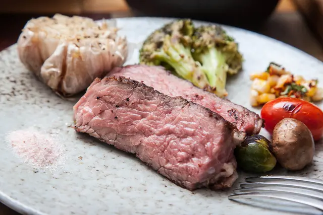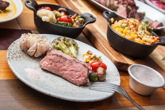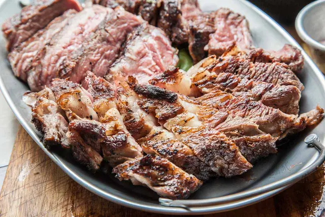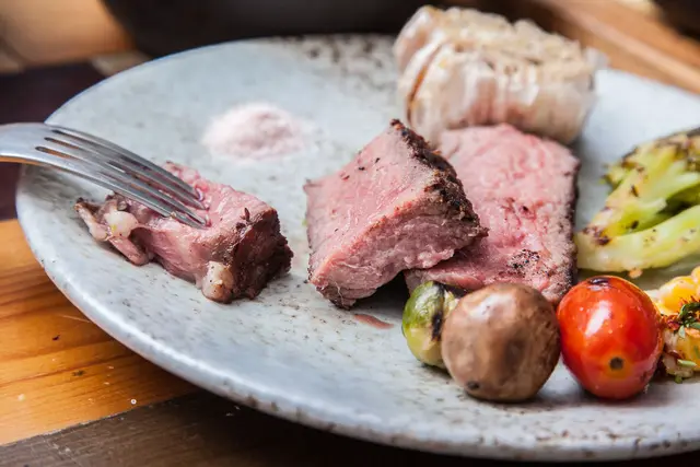 以龍眼木直火碳烤的牛排香氣就是不一樣!光聞那燒烤香就足以讓人口水流滿地,肋眼上蓋肉質多汁軟嫩,油花甘美,肋眼帶紮實的肉感嚼勁,入口油花及肉汁在口中交織出濃郁的肉香感,骨邊肉則是吃它焦脆Q嫩的帶筋肉,越吃越香,三種肉輪著吃太享受了!