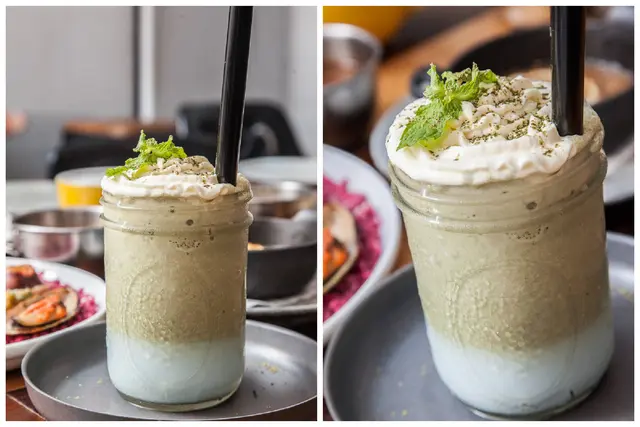 下面是蝶豆花,上面是抹茶和鮮奶油,有著漂亮的漸層色彩,隨著時間抹茶和蝶豆花會慢慢的融合在一起,使用的是日本抹茶,甘醇芳香