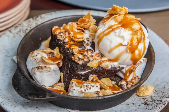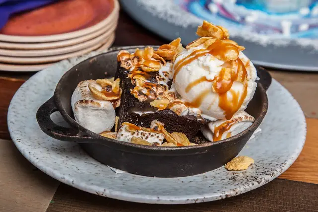 史莫夫在這裡是指炭烤融化過後的棉花糖搭配我們手工的巧克力布朗尼疊在一起後炭烤爐把鐵盤加熱到融化後再淋上一大坨香草冰琪淋,加上甜脆的玉米脆片,創造出美味的冰與火之歌