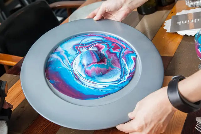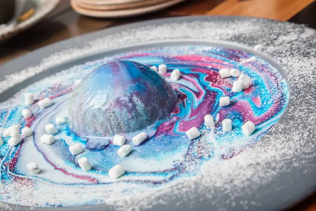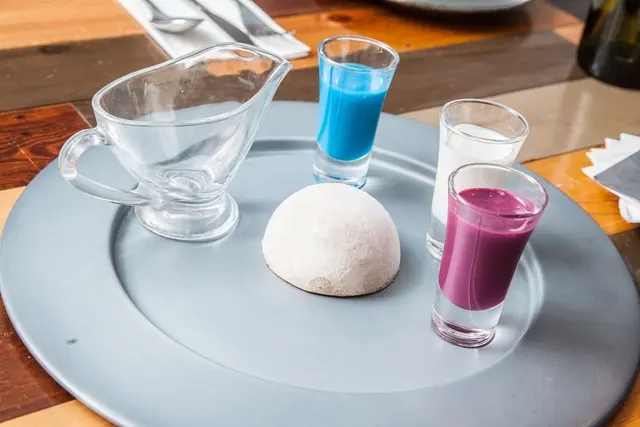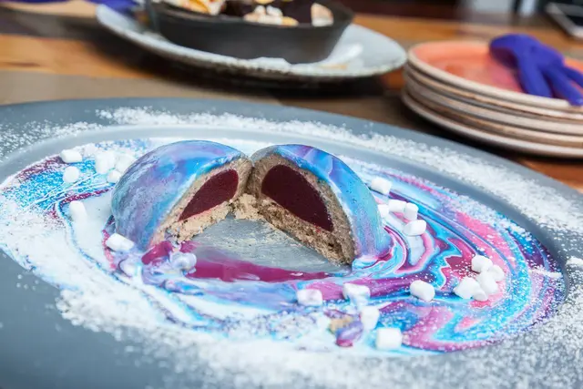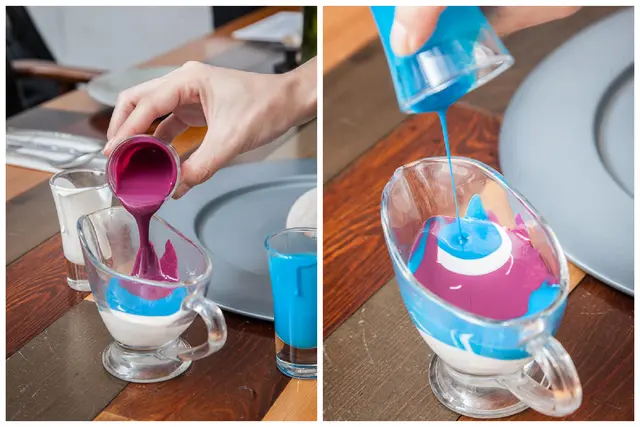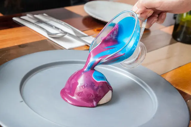 這道甜點是讓客人DIY,先將三種不同顏色的糖漿倒在一起融合,再將混合的糖漿直接淋上由使用伯爵茶和覆盆莓做成的幕斯上